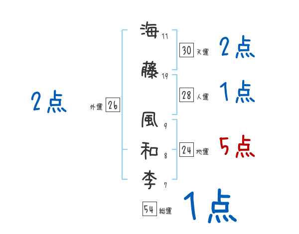 天運![]() | 海藤風和李さんの天運は30画の2つ星!浮き沈みの激しさに注意しましょう。 家系が持つ宿命的な運勢を表します。祖先から受け継いだ苗字ですので自分の力が及びません。家柄を象徴します。 |