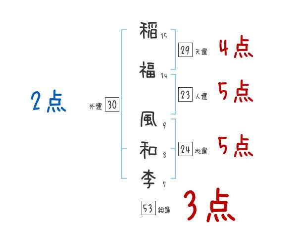 天運![]() | 稲福風和李さんの天運は29画の4つ星!完全主義で才能がある。厳格な心の持ち主。 家系が持つ宿命的な運勢を表します。祖先から受け継いだ苗字ですので自分の力が及びません。家柄を象徴します。 |