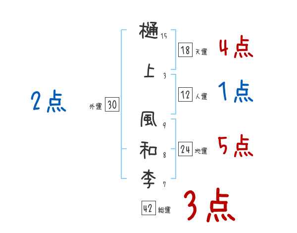 外運![]() | 樋上風和李さんの外運は30画の2つ星!浮き沈みの激しさに注意しましょう。 生活面を象徴する運勢です。外部から受ける影響力を表し、結婚運、家庭運や職場、環境への順応性を表します。 |