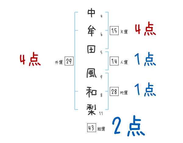 外運![]() | 中牟田風和梨さんの外運は29画の4つ星!完全主義で才能がある。厳格な心の持ち主。 生活面を象徴する運勢です。外部から受ける影響力を表し、結婚運、家庭運や職場、環境への順応性を表します。 |