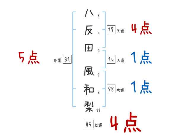 天運![]() | 八反田風和梨さんの天運は17画の4つ星!積極的な行動力。地位を気づき財産を手に入れる。純粋な心と直感力。 家系が持つ宿命的な運勢を表します。祖先から受け継いだ苗字ですので自分の力が及びません。家柄を象徴します。 |