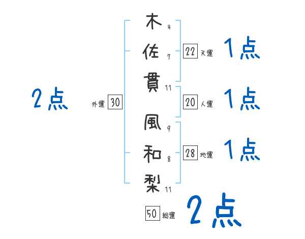 天運![]() | 木佐貫風和梨さんの天運は22画の1つ星!努力することが苦手ないっぽう手先が器用。芸術性にも優れる。 家系が持つ宿命的な運勢を表します。祖先から受け継いだ苗字ですので自分の力が及びません。家柄を象徴します。 |