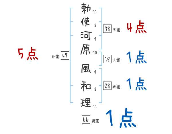 外運![]() | 勅使河原風和理さんの外運は47画の5つ星!実力が開花し発展する円満な人生。財に恵まれる。 生活面を象徴する運勢です。外部から受ける影響力を表し、結婚運、家庭運や職場、環境への順応性を表します。 |