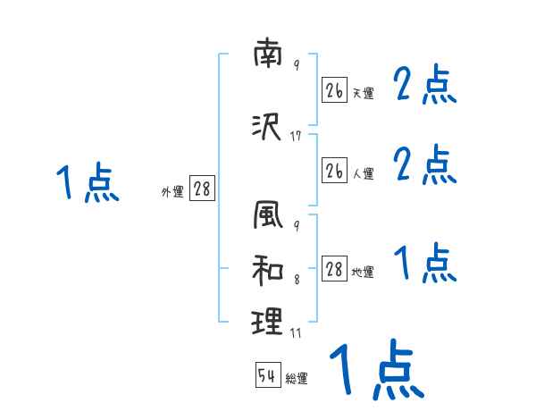 外運![]() | 南沢風和理さんの外運は28画の1つ星!家庭環境に注意。スポーツで活躍できる能力があるかも。 生活面を象徴する運勢です。外部から受ける影響力を表し、結婚運、家庭運や職場、環境への順応性を表します。 |