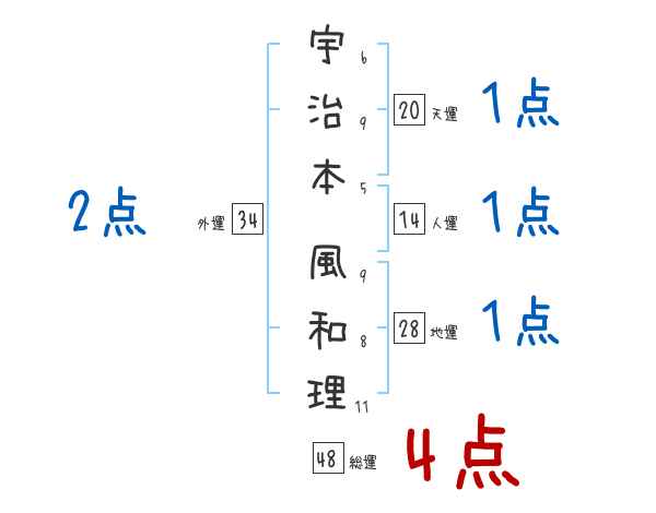 外運![]() | 宇治本風和理さんの外運は34画の2つ星!独創性に優れるが、自尊心が強く災難に注意しましょう。 生活面を象徴する運勢です。外部から受ける影響力を表し、結婚運、家庭運や職場、環境への順応性を表します。 |