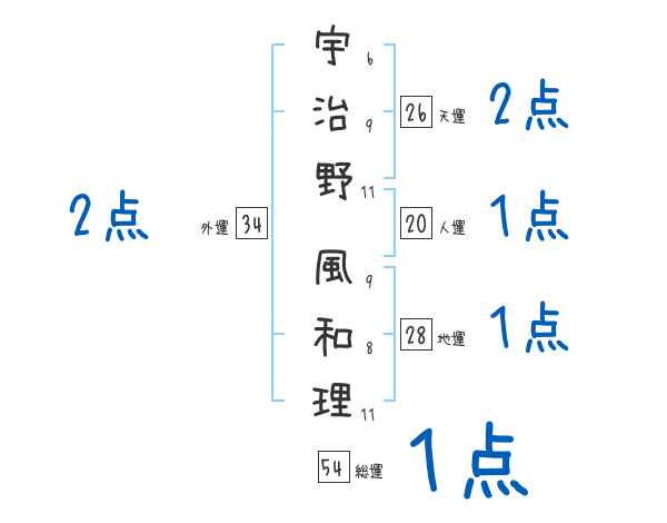 天運![]() | 宇治野風和理さんの天運は26画の2つ星!波瀾万丈かも。信頼できる人を大事にしましょう。 家系が持つ宿命的な運勢を表します。祖先から受け継いだ苗字ですので自分の力が及びません。家柄を象徴します。 |