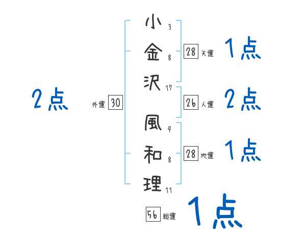 天運![]() | 小金沢風和理さんの天運は28画の1つ星!家庭環境に注意。スポーツで活躍できる能力があるかも。 家系が持つ宿命的な運勢を表します。祖先から受け継いだ苗字ですので自分の力が及びません。家柄を象徴します。 |