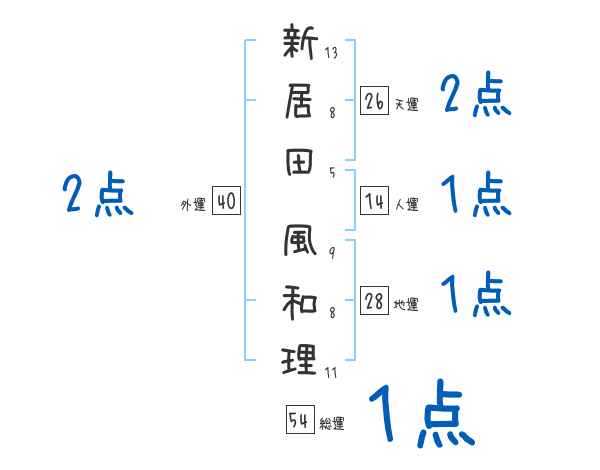 外運![]() | 新居田風和理さんの外運は40画の2つ星!自信過剰で物事に固執するためトラブルに注意。 生活面を象徴する運勢です。外部から受ける影響力を表し、結婚運、家庭運や職場、環境への順応性を表します。 |