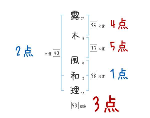 | 人運  | 露木風和理さんの人運は13画の5つ星!才能に恵まれ人気がある。名声を手に入れる。円満な人生。性格や才能などを表す2番目に重要な運勢です。人間関係や協調性、社会的な成功に影響します。主に20歳から50歳ぐらいまでの中年期の運勢を表します。 |