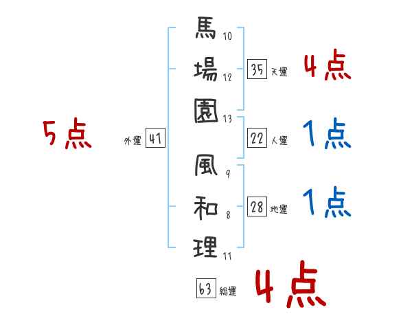 総運![]() | 馬場園風和理さんの総運は63画の4つ星!家庭運がよく順調な生活。温和な性格。 あなたの人生を表す1番重要な運勢です。生涯を通じて影響する総合運となり、主に50歳以降の晩年期に影響を及ぼします。 |