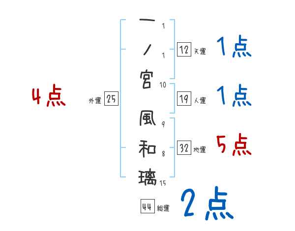 総運![]() | 一ノ宮風和璃さんの総運は44画の2つ星!誠実で慎重な性格。物事を考えすぎないように注意しましょう。 あなたの人生を表す1番重要な運勢です。生涯を通じて影響する総合運となり、主に50歳以降の晩年期に影響を及ぼします。 |