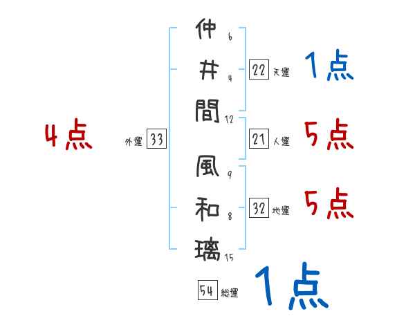 総運![]() | 仲井間風和璃さんの総運は54画の1つ星!トラブルが多いかも。周りをよく見て協調して過ごしましょう。 あなたの人生を表す1番重要な運勢です。生涯を通じて影響する総合運となり、主に50歳以降の晩年期に影響を及ぼします。 |