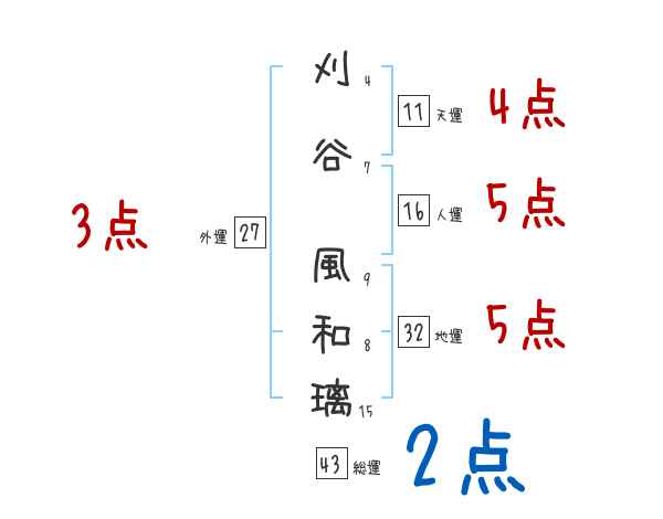 外運![]() | 刈谷風和璃さんの外運は27画の3つ星!頭脳明晰だが強情で摩擦が多い傾向。孤立に注意。 生活面を象徴する運勢です。外部から受ける影響力を表し、結婚運、家庭運や職場、環境への順応性を表します。 |