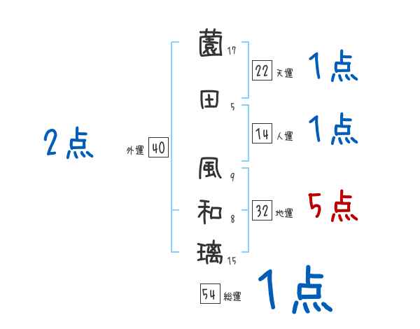 天運![]()  | 薗田風和璃さんの天運は22画の1つ星!努力することが苦手ないっぽう手先が器用。芸術性にも優れる。 家系が持つ宿命的な運勢を表します。祖先から受け継いだ苗字ですので自分の力が及びません。家柄を象徴します。 |