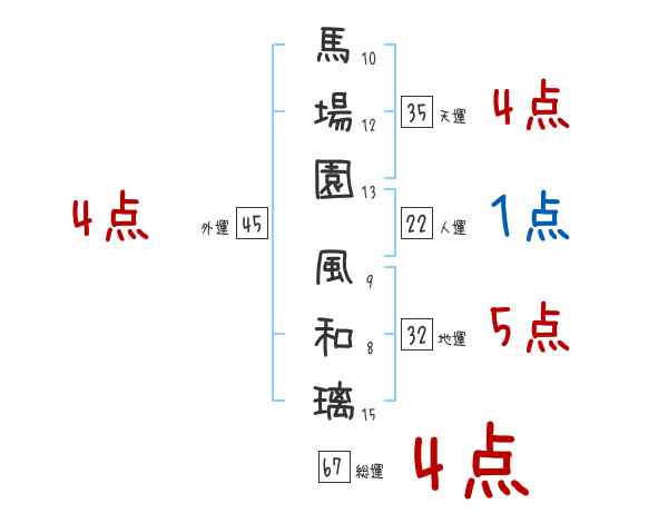 天運![]() | 馬場園風和璃さんの天運は35画の4つ星!温厚な性格で感受性が高い。穏和な性格で人望が厚い。 家系が持つ宿命的な運勢を表します。祖先から受け継いだ苗字ですので自分の力が及びません。家柄を象徴します。 |