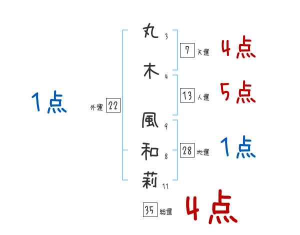 天運![]() | 丸木風和莉さんの天運は7画の4つ星!強い意志や信念を持ち独立心が強い。自立する。 家系が持つ宿命的な運勢を表します。祖先から受け継いだ苗字ですので自分の力が及びません。家柄を象徴します。 |