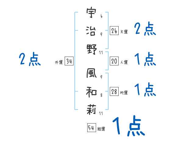 天運![]() | 宇治野風和莉さんの天運は26画の2つ星!波瀾万丈かも。信頼できる人を大事にしましょう。 家系が持つ宿命的な運勢を表します。祖先から受け継いだ苗字ですので自分の力が及びません。家柄を象徴します。 |