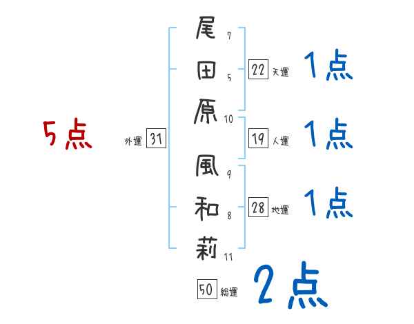外運![]() | 尾田原風和莉さんの外運は31画の5つ星!社交性があり判断力に優れる。順風満帆な人生で円満な生活。 生活面を象徴する運勢です。外部から受ける影響力を表し、結婚運、家庭運や職場、環境への順応性を表します。 |
