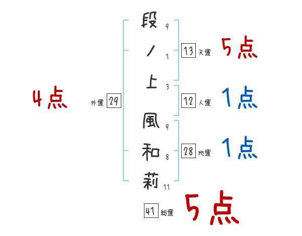 人運![]() | 段ノ上風和莉さんの人運は12画の1つ星!簡単な失敗で諦めてしまいやすいかも。着実に行動すると良いでしょう。 性格や才能などを表す2番目に重要な運勢です。人間関係や協調性、社会的な成功に影響します。主に20歳から50歳ぐらいまでの中年期の運勢を表します。 |