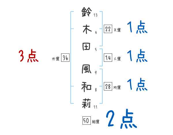 外運![]() | 鈴木田風和莉さんの外運は36画の3つ星!先見性が豊かです。多少神経質で苦労することも。 生活面を象徴する運勢です。外部から受ける影響力を表し、結婚運、家庭運や職場、環境への順応性を表します。 |
