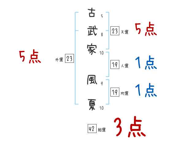 天運![]() | 古武家風夏さんの天運は23画の5つ星!想像力に優れ活力がある。一代で成功し名誉を手に入れる。 家系が持つ宿命的な運勢を表します。祖先から受け継いだ苗字ですので自分の力が及びません。家柄を象徴します。 |