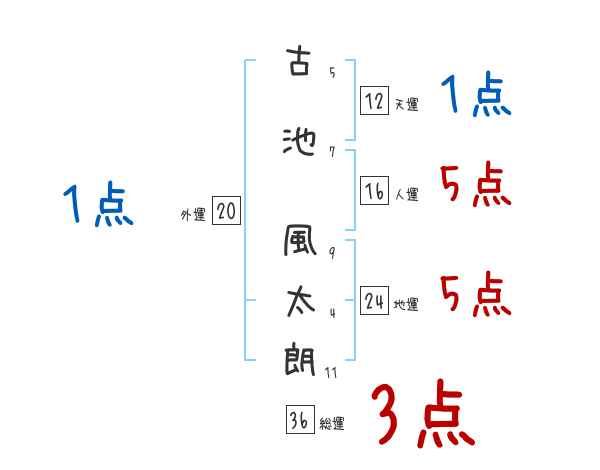 総運![]() | 古池風太朗さんの総運は36画の3つ星!先見性が豊かです。多少神経質で苦労することも。 あなたの人生を表す1番重要な運勢です。生涯を通じて影響する総合運となり、主に50歳以降の晩年期に影響を及ぼします。 |