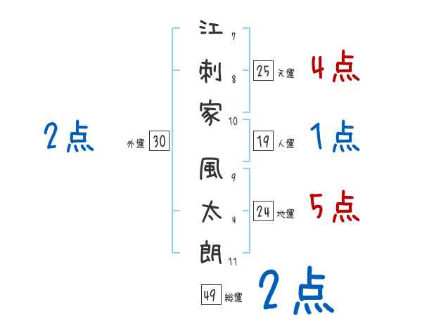 天運![]() | 江刺家風太朗さんの天運は25画の4つ星!個性があり才能があふれる。強運の持ち主で発展する。 家系が持つ宿命的な運勢を表します。祖先から受け継いだ苗字ですので自分の力が及びません。家柄を象徴します。 |