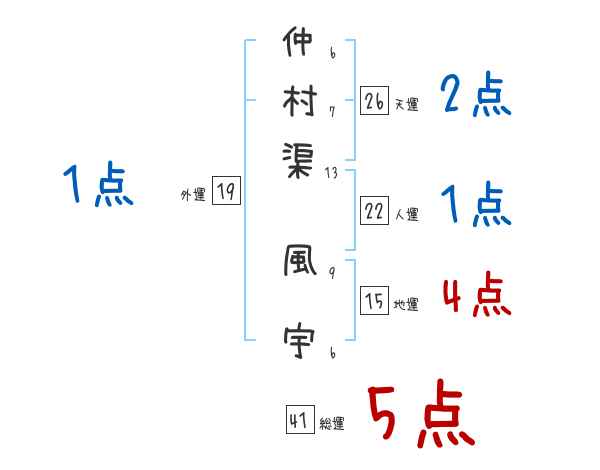 外運![]() | 仲村渠風宇さんの外運は19画の1つ星!優れた才能を持ちますが、協調性が足りないことも。周りの人と協力する事を意識しましょう。 生活面を象徴する運勢です。外部から受ける影響力を表し、結婚運、家庭運や職場、環境への順応性を表します。 |