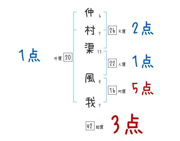 天運![]() | 仲村渠風我さんの天運は26画の2つ星!波瀾万丈かも。信頼できる人を大事にしましょう。 家系が持つ宿命的な運勢を表します。祖先から受け継いだ苗字ですので自分の力が及びません。家柄を象徴します。 |