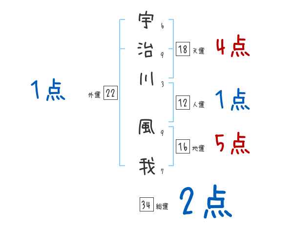 天運![]() | 宇治川風我さんの天運は18画の4つ星!情熱的で剛気。忍耐力があり信頼される。 家系が持つ宿命的な運勢を表します。祖先から受け継いだ苗字ですので自分の力が及びません。家柄を象徴します。 |