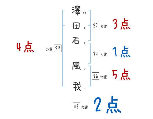 外運![]() | 澤田石風我さんの外運は29画の4つ星!完全主義で才能がある。厳格な心の持ち主。 生活面を象徴する運勢です。外部から受ける影響力を表し、結婚運、家庭運や職場、環境への順応性を表します。 |