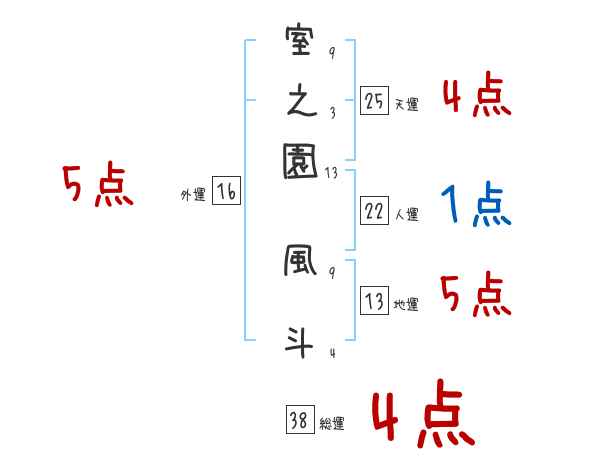 外運![]() | 室之園風斗さんの外運は16画の5つ星!人望が厚く大きく発展する。逆転成功が見える。 生活面を象徴する運勢です。外部から受ける影響力を表し、結婚運、家庭運や職場、環境への順応性を表します。 |