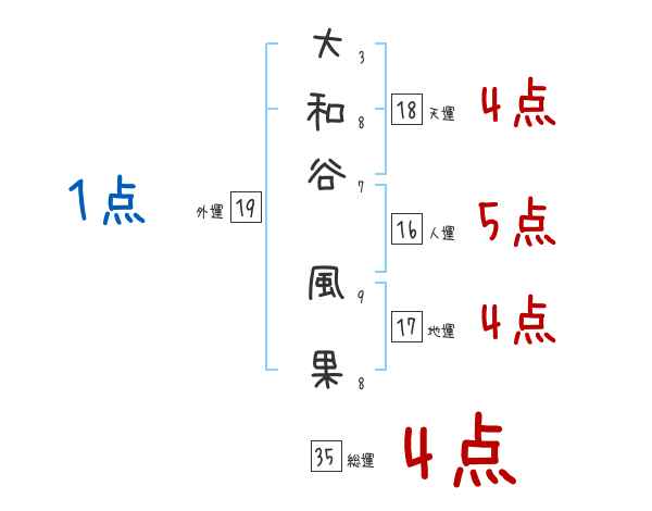 天運![]() | 大和谷風果さんの天運は18画の4つ星!情熱的で剛気。忍耐力があり信頼される。 家系が持つ宿命的な運勢を表します。祖先から受け継いだ苗字ですので自分の力が及びません。家柄を象徴します。 |