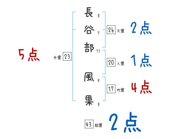天運![]() | 長谷部風果さんの天運は26画の2つ星!波瀾万丈かも。信頼できる人を大事にしましょう。 家系が持つ宿命的な運勢を表します。祖先から受け継いだ苗字ですので自分の力が及びません。家柄を象徴します。 |