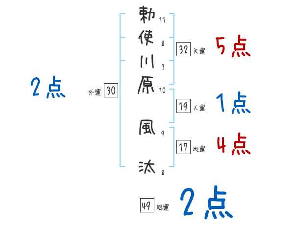 天運![]() | 勅使川原風汰さんの天運は32画の5つ星!柔軟性があり成功する。チャンスが多く金運が良い。 家系が持つ宿命的な運勢を表します。祖先から受け継いだ苗字ですので自分の力が及びません。家柄を象徴します。 |