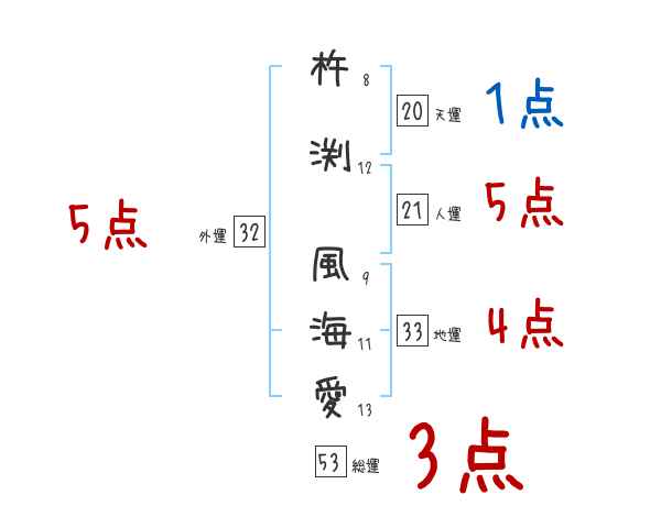 外運![]() | 杵渕風海愛さんの外運は32画の5つ星!柔軟性があり成功する。チャンスが多く金運が良い。 生活面を象徴する運勢です。外部から受ける影響力を表し、結婚運、家庭運や職場、環境への順応性を表します。 |