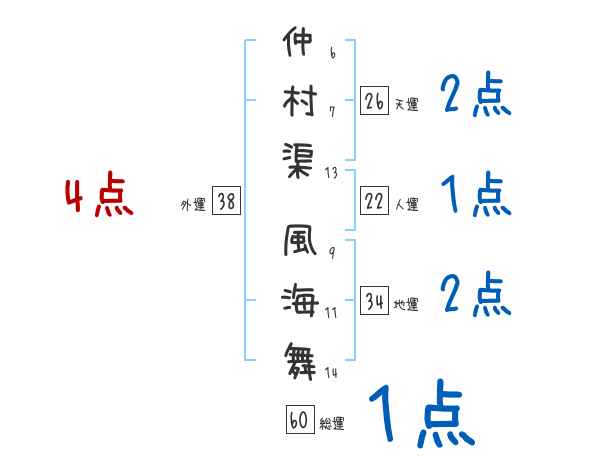 天運![]() | 仲村渠風海舞さんの天運は26画の2つ星!波瀾万丈かも。信頼できる人を大事にしましょう。 家系が持つ宿命的な運勢を表します。祖先から受け継いだ苗字ですので自分の力が及びません。家柄を象徴します。 |