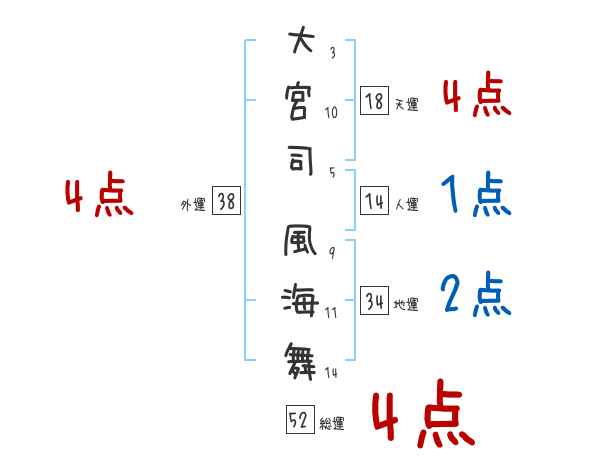 外運![]() | 大宮司風海舞さんの外運は38画の4つ星!温厚な性格で技術的な才能を発揮する。職人的な仕事に向いている。 生活面を象徴する運勢です。外部から受ける影響力を表し、結婚運、家庭運や職場、環境への順応性を表します。 |