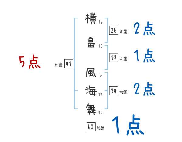 総運![]() | 横畠風海舞さんの総運は60画の1つ星!悲観的で迷いやすい。波乱が多く損をしないように。 あなたの人生を表す1番重要な運勢です。生涯を通じて影響する総合運となり、主に50歳以降の晩年期に影響を及ぼします。 |