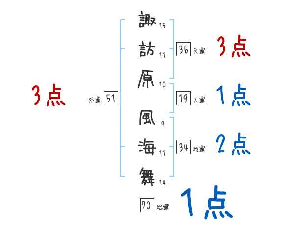 外運![]() | 諏訪原風海舞さんの外運は51画の3つ星!変化が激しく、危険に注意。堅実な性格。 生活面を象徴する運勢です。外部から受ける影響力を表し、結婚運、家庭運や職場、環境への順応性を表します。 |