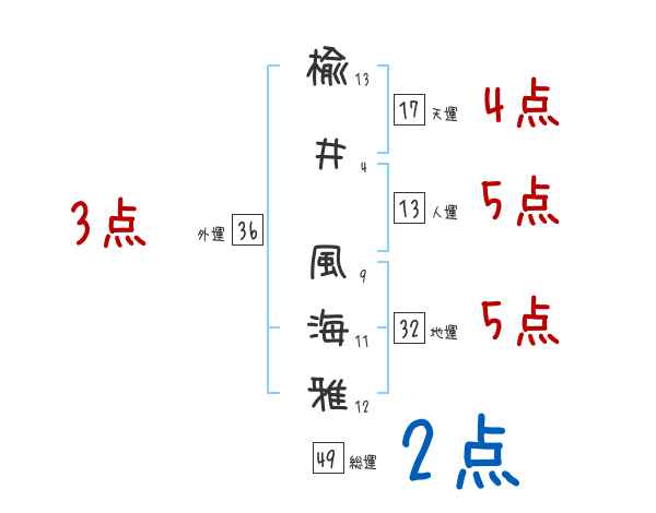 地運![]() | 楡井風海雅さんの地運は32画の5つ星!柔軟性があり成功する。チャンスが多く金運が良い。 個性を表す基礎的な運勢です。性格形成や対人関係、行動力など家庭環境に影響されます。主に誕生してから20歳くらいまでの若年期の運勢を表します。 |