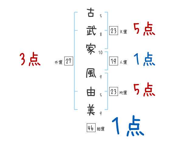 天運![]() | 古武家風由美さんの天運は23画の5つ星!想像力に優れ活力がある。一代で成功し名誉を手に入れる。 家系が持つ宿命的な運勢を表します。祖先から受け継いだ苗字ですので自分の力が及びません。家柄を象徴します。 |