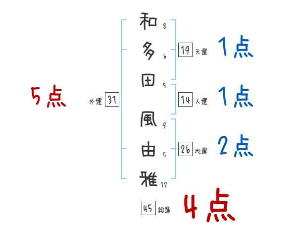 外運![]() | 和多田風由雅さんの外運は31画の5つ星!社交性があり判断力に優れる。順風満帆な人生で円満な生活。 生活面を象徴する運勢です。外部から受ける影響力を表し、結婚運、家庭運や職場、環境への順応性を表します。 |