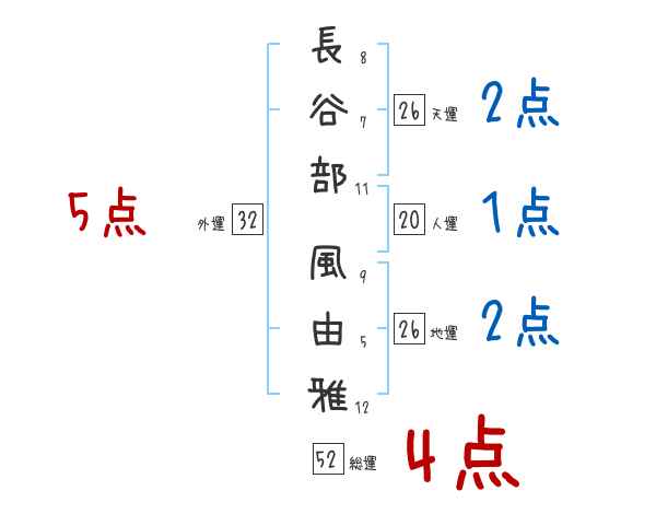 外運![]() | 長谷部風由雅さんの外運は32画の5つ星!柔軟性があり成功する。チャンスが多く金運が良い。 生活面を象徴する運勢です。外部から受ける影響力を表し、結婚運、家庭運や職場、環境への順応性を表します。 |