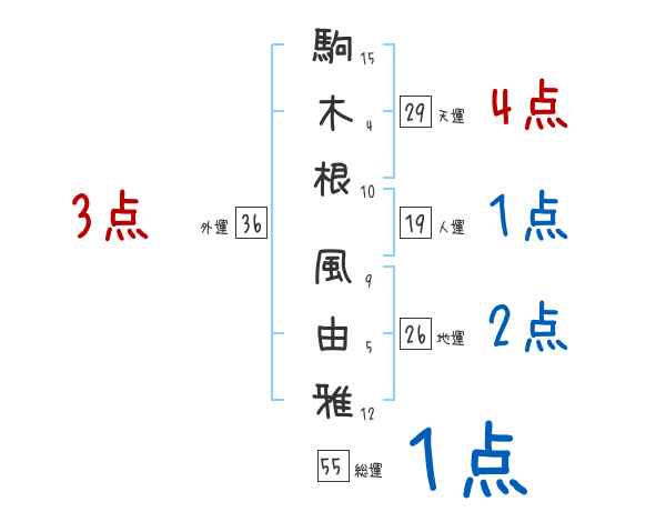 人運![]() | 駒木根風由雅さんの人運は19画の1つ星!優れた才能を持ちますが、協調性が足りないことも。周りの人と協力する事を意識しましょう。 性格や才能などを表す2番目に重要な運勢です。人間関係や協調性、社会的な成功に影響します。主に20歳から50歳ぐらいまでの中年期の運勢を表します。 |