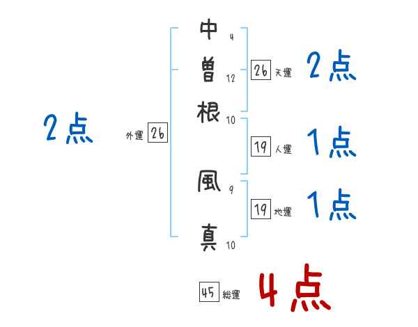 外運![]() | 中曽根風真さんの外運は26画の2つ星!波瀾万丈かも。信頼できる人を大事にしましょう。 生活面を象徴する運勢です。外部から受ける影響力を表し、結婚運、家庭運や職場、環境への順応性を表します。 |
