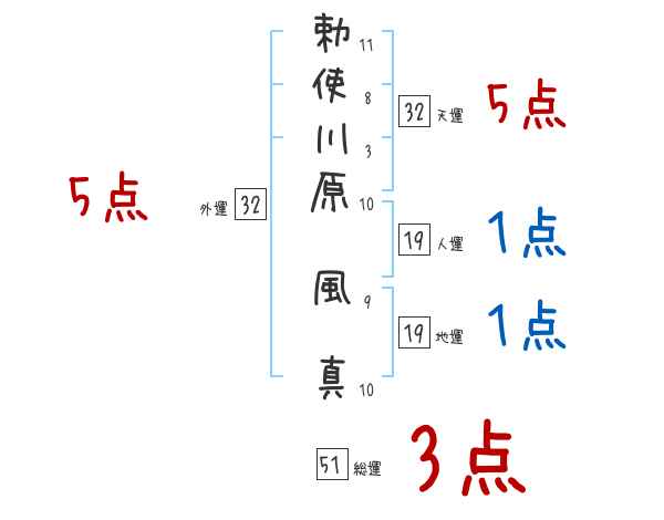 天運![]() | 勅使川原風真さんの天運は32画の5つ星!柔軟性があり成功する。チャンスが多く金運が良い。 家系が持つ宿命的な運勢を表します。祖先から受け継いだ苗字ですので自分の力が及びません。家柄を象徴します。 |