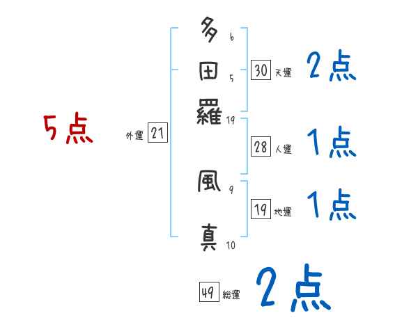 天運![]() | 多田羅風真さんの天運は30画の2つ星!浮き沈みの激しさに注意しましょう。 家系が持つ宿命的な運勢を表します。祖先から受け継いだ苗字ですので自分の力が及びません。家柄を象徴します。 |