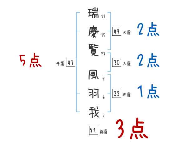 天運![]() | 瑞慶覧風羽我さんの天運は49画の2つ星!不安定な性格で明暗がある人生。周りの人には支援されやすい。 家系が持つ宿命的な運勢を表します。祖先から受け継いだ苗字ですので自分の力が及びません。家柄を象徴します。 |