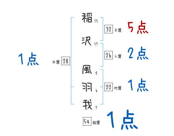 天運![]() | 稲沢風羽我さんの天運は32画の5つ星!柔軟性があり成功する。チャンスが多く金運が良い。 家系が持つ宿命的な運勢を表します。祖先から受け継いだ苗字ですので自分の力が及びません。家柄を象徴します。 |
